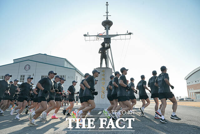 [더팩트ㅣ임영무 기자] 해군 해난구조전대 심해잠수사들이 17일 경남 진해 군항에서 실시된 혹한기 내한훈련에 참석해 단체 달리기를 하고 있다.