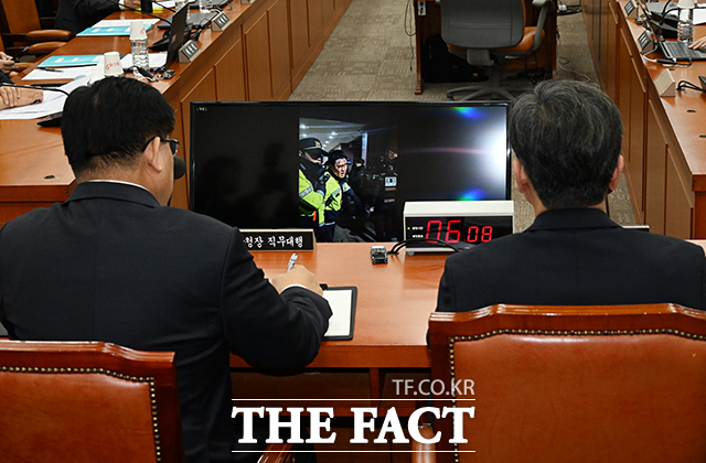 [더팩트ㅣ국회=배정한 기자] 이호영 경찰청장 직무대행(왼쪽)이 20일 오후 서울 여의도 국회에서 서부지법 불법 폭력 점거 시위 사태 관련 긴급 현안 질의를 위한 행정안전위원회 전체회의에 참석해 피를 흘리고 있는 경찰 영상을 확인하고 있다.hany@tf.co.kr사진영상기획부 photo@tf.co.kr