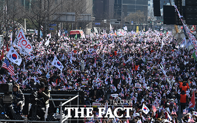 [더팩트ㅣ박헌우 기자] '윤석열 대통령 탄핵 반대 광화문 국민대회'가 25일 오후 서울 종로구 세종대로 일대에서 열린 가운데 집회 참가자들이 태극기와 성조기를 흔들고 있다.