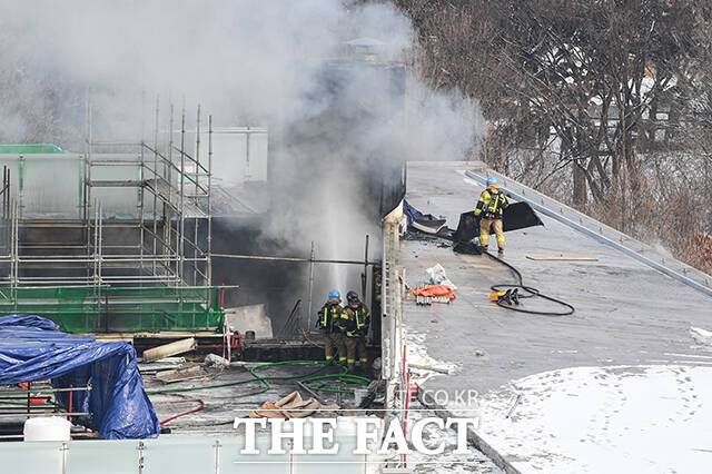 [더팩트ㅣ장윤석 기자] 1일 오전 서울 용산구 국립한글박물관 옥상에서 화재가 발생한 가운데 소방대원들이 화재 진압 작업을 펼치고 있다.