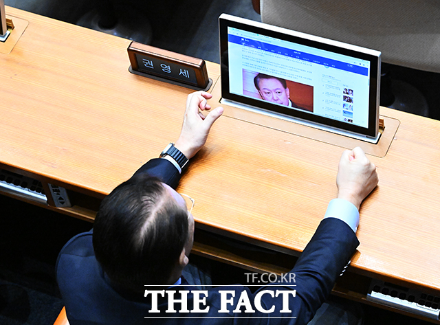[더팩트ㅣ국회=배정한 기자] 권영세 국민의힘 비대위원장이 3일 오후 서울 여의도 국회에서 열린 제422회 국회(임시회) 제1차 본회의 개회식에 참석해 윤석열 대통령과 관련된 기사를 확인하고 있다.