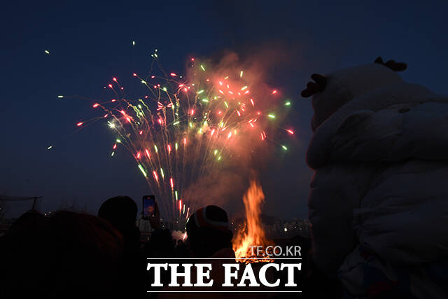 [더팩트ㅣ서예원 기자] '제23회 양천구 정월대보름 민속 축제'가 8일 오후 서울 양천구 안양천 신정교 일대에서 열린 가운데 시민들이 달집태우기와 불꽃놀이를 관람하며 건강과 안녕을 기원하고 있다.