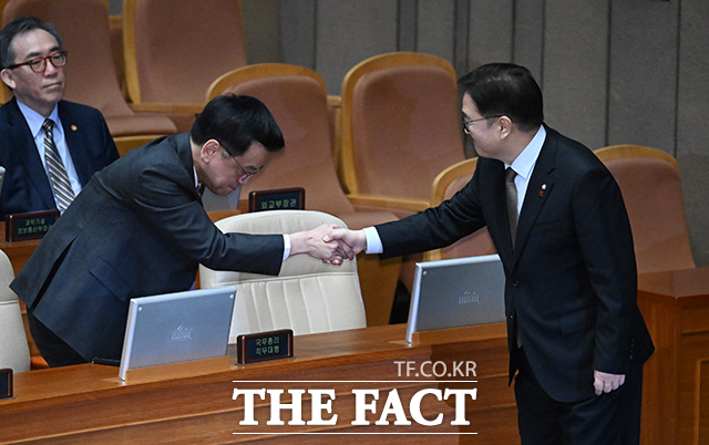 [더팩트ㅣ국회=박헌우 기자] 최상목 대통령 권한대행 부총리 겸 기획재정부 장관(왼쪽)과 우원식 국회의장이 10일 오전 서울 여의도 국회에서 열린 본회의에 참석해 인사를 나누고 있다.