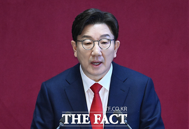 [더팩트ㅣ국회=박헌우 기자] 권성동 국민의힘 원내대표가 11일 오전 서울 여의도 국회에서 열린 본회의에 참석해 교섭단체 대표 연설을 하고 있다.