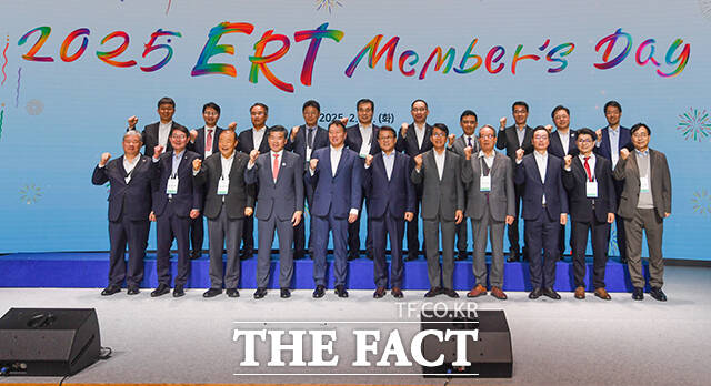 [더팩트ㅣ장윤석 기자] 최태원 대한상공회의소 회장(왼쪽 다섯 번째)이 11일 오전 서울 중구 상의회관에서 열린 ERT 멤버스데이에 참석해 기념 촬영을 하고 있다.j3321362@tf.co.kr사진영상기획부 photo@tf.co.kr
