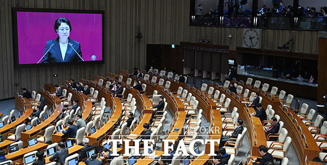 [더팩트ㅣ국회=박헌우 기자] 김선민 조국혁신당 대표 권한대행이 12일 오후 서울 여의도 국회에서 열린 본회의에 참석해 비교섭단체 대표 연설 중인 가운데 국민의힘 의원들의 자리가 비어 있다.