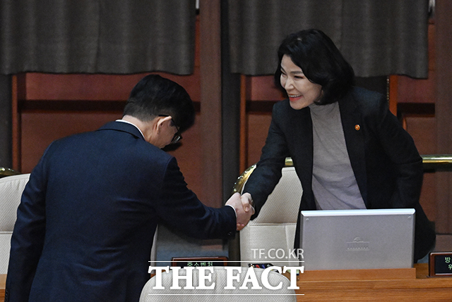 [더팩트ㅣ국회=박헌우 기자] 김문수 고용노동부 장관(왼쪽)과 이진숙 방송통신위원장이 14일 오후 서울 여의도 국회에서 열린 본회의에 참석해 악수를 하고 있다.cjg05023@tf.co.kr사진영상기획부 photo@tf.co.kr