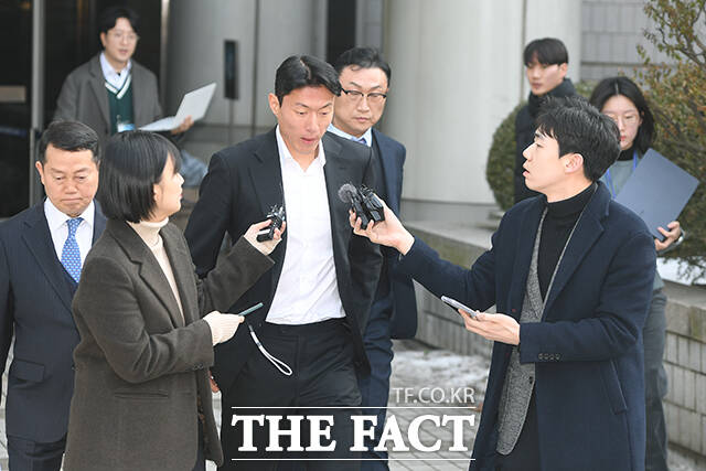[더팩트ㅣ장윤석 기자] 축구 선수 황의조(가운데)가 14일 오후 서울 서초구 서울중앙지법에서 열린 1심 선고 공판을 마친 뒤 법원을 나서고 있다.j3321362@tf.co.kr사진영상기획부 photo@tf.co.kr