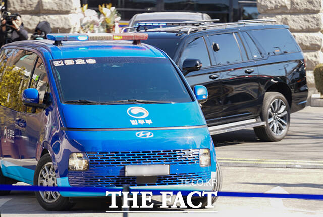 [더팩트ㅣ사진공동취재단] 윤석열 대통령 탄핵심판 9차 변론기일이 열린 18일 오후 윤 대통령이 탄 법무부 호송차량이 서울 종로구 헌법재판소 안으로 들어서고 있다.