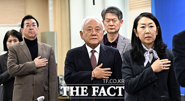 [더팩트ㅣ임영무 기자] 김한길 국민통합위원회 위원장(가운데)이 25일 오전 서울 종로구 정부서울청사에서 열린 전체회의에 참석해 국기에 대한 경례를 하고 있다.