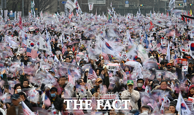 [더팩트ㅣ박헌우 기자] 윤석열 대통령 탄핵 반대 집회가 1일 오후 서울 종로구 세종대로 일대에서 열린 가운데 참가자들이 태극기와 성조기를 흔들고 있다.