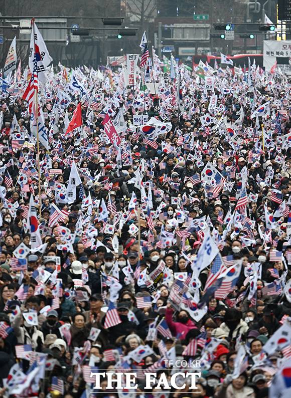 [더팩트ㅣ박헌우 기자] 윤석열 대통령 탄핵 반대 집회가 1일 오후 서울 종로구 세종대로 일대에서 열린 가운데 참가자들이 태극기와 성조기를 흔들고 있다.