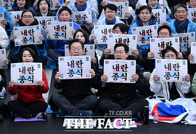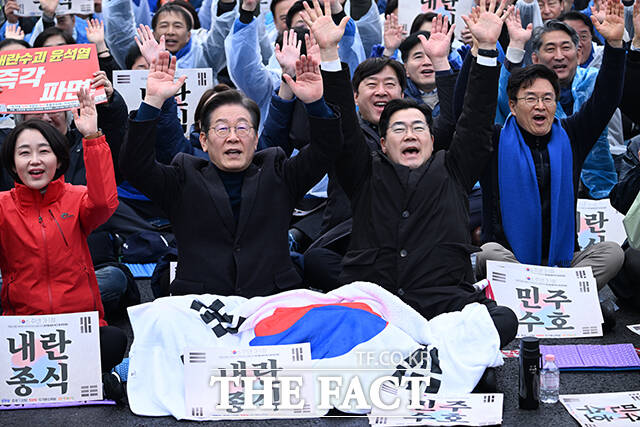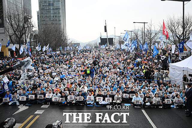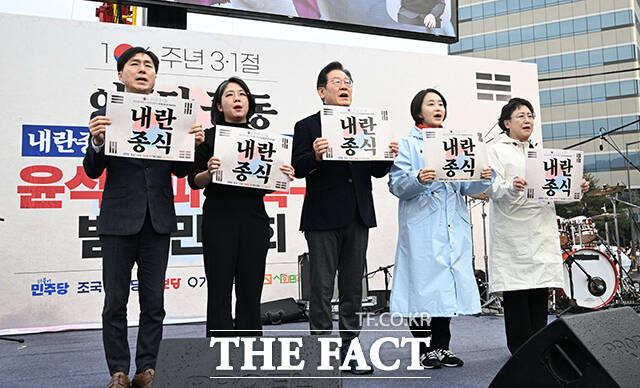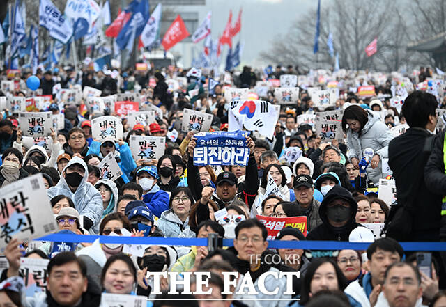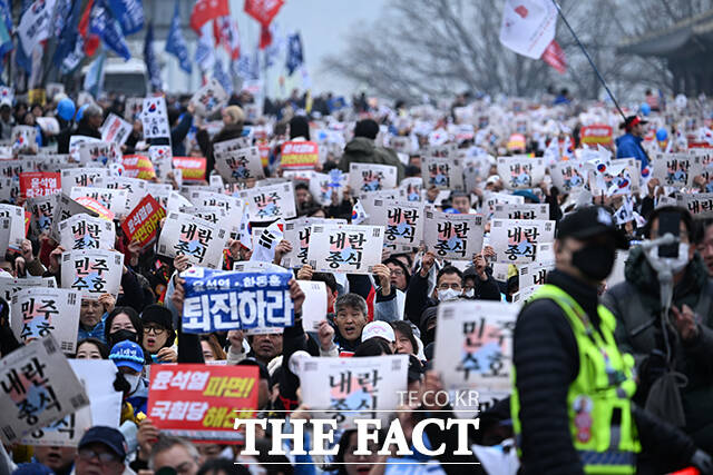 [더팩트ㅣ박헌우 기자] '야 5당 공동 내란종식·민주헌정수호를 한 윤석열 파면 촉구 범국민대회'가 1일 오후 서울 종로구 안국동 사거리에서 열린 가운데 참가자들이 피켓을 들고 구호를 외치고 있다.