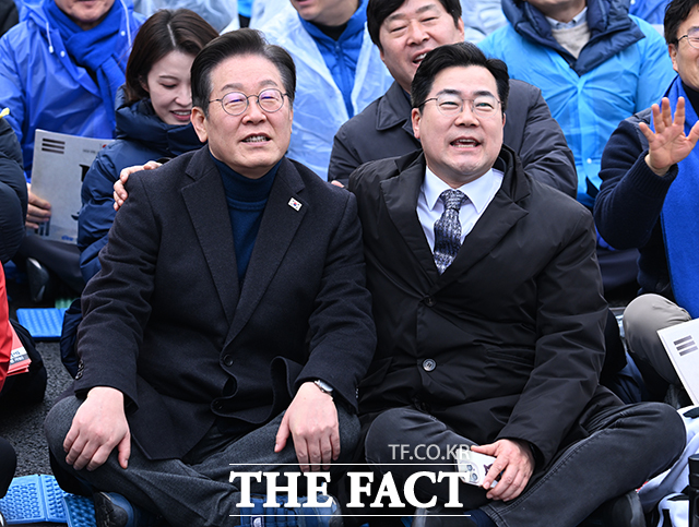 [더팩트ㅣ박헌우 기자] 이재명 더불어민주당 대표(왼쪽)와 박찬대 원내대표가 1일 오후 서울 종로구 안국동 사거리에서 열린 '야 5당 공동 내란종식·민주헌정수호를 한 윤석열 파면 촉구 범국민대회'에 참석해 노래를 부르고 있다.