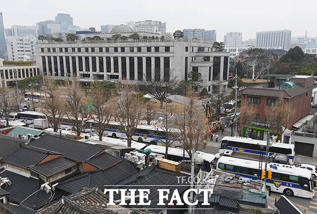 [더팩트ㅣ장윤석 기자] 윤석열 대통령 탄핵심판 선고가 임박한 12일 오전 서울 종로구 헌법재판소 인근 도로에 경찰 차벽이 설치돼 있다.