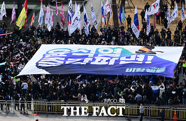 [더팩트ㅣ임영무 기자] 윤석열 즉각 파면 촉구 각계 긴급시국선언이 17일 오후 서울 광화문 광장에서 열린 가운데 '윤석열 즉각파면' 대형 현수막이 펼쳐지고 있다.