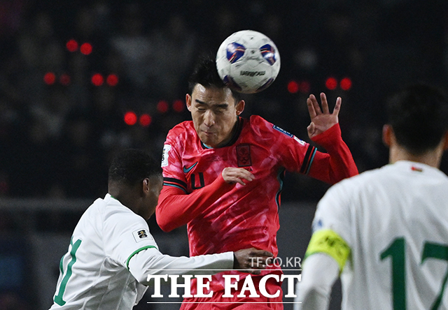 [더팩트|고양종합운동장=박헌우 기자] 대한민국과 오만의 2026 FIFA 북중미 월드컵 3차 예선전이 20일 오후 경기 고양시 고양종합운동장에서 열린 가운데 조유민이 헤더를 시도하고 있다.