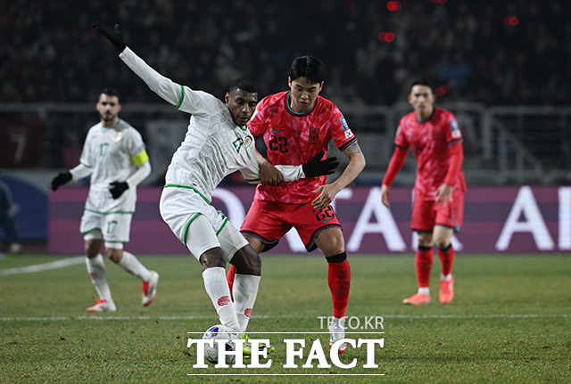 [더팩트|고양종합운동장=박헌우 기자] 대한민국과 오만의 2026 FIFA 북중미 월드컵 3차 예선전이 20일 오후 경기 고양시 고양종합운동장에서 열린 가운데 설영우가 볼 다툼을 하고 있다.
