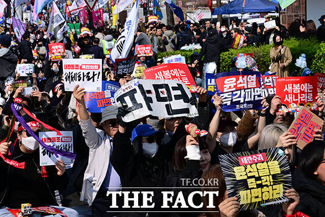 '만장일치 8:0 파면' 촉구하는 탄핵찬성 집회 참가자들 [TF사진관]