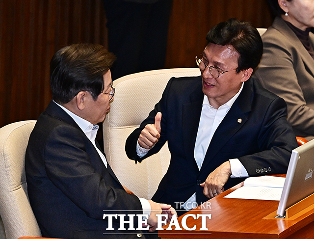 [더팩트ㅣ국회=배정한 기자] 이재명 더불어민주당 전 대표(왼쪽)와 김민석 최고위원이 17일 오후 서울 여의도 국회에서 열린 제424회 국회(임시회) 제5차 본회의에 참석해 대화를 하고 있다.