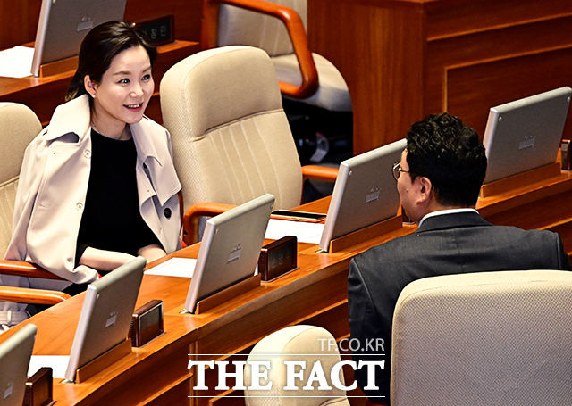 [더팩트ㅣ국회=배정한 기자] 이주영 개혁신당 의원(왼쪽)이 17일 오후 서울 여의도 국회에서 열린 제424회 국회(임시회) 제5차 본회의에 참석해 천하람 의원과 대화를 하고 있다.