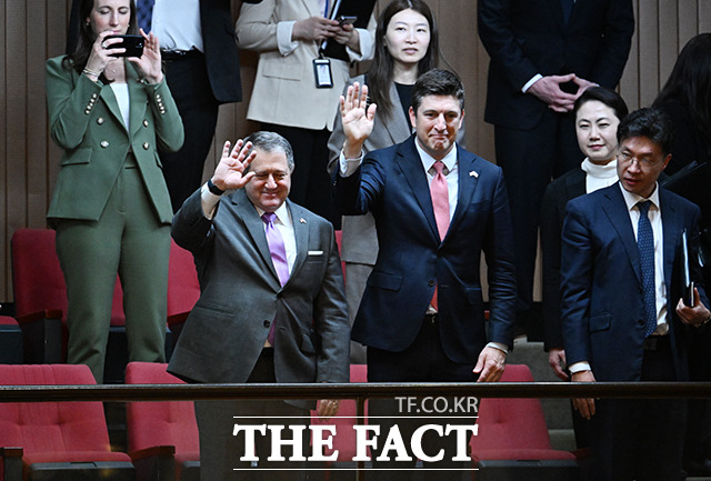[더팩트ㅣ국회=박헌우 기자] 브라이언 스테일, 조 모렐리를 비롯한 미국 하원 운영위원회 방한단이 17일 오후 서울 여의도 국회에서 열린 본회의를 찾아 의원들을 향해 손을 흔들고 있다.