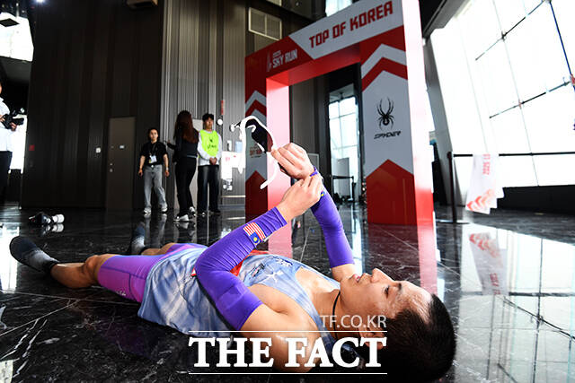 [더팩트ㅣ서예원 기자] '2025 스카이런 withe SPYDER'이 20일 오전 서울 송파구 롯데월드타워에서 열린 가운데 한 참가자가 결승점을 통과해 기록을 확인하고 있다.