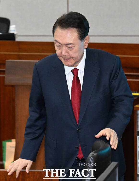 [더팩트ㅣ이새롬 기자] 윤석열 전 대통령이 21일 서울 서초동 서울중앙지법에서 열린 내란 우두머리 혐의 형사재판 2번째 공판에 출석해 피고인석에 착석해 있다.