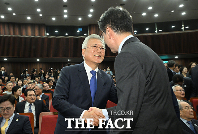 [더팩트ㅣ국회=박헌우 기자] 문재인 전 대통령(왼쪽)이 25일 서울 여의도 국회도서관에서 열린 4.27 판문점선언 7주년 기념식에 참석해 김경수 더불어민주당 대선 경선 후보와 인사를 나누고 있다.cjg05023@tf.co.kr사진영상기획부 photo@tf.co.kr