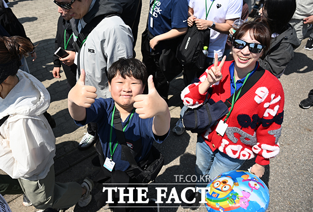 [더팩트|하남=박헌우 기자] 상상인 그룹 '2025 피크닉데이 가족, 동료와 함께 걷기' 행사가 26일 오전 경기 하남시 미사경정공원에서 열린 가운데 임직원과 가족들이 양손 엄지를 치켜세우고 있다.
