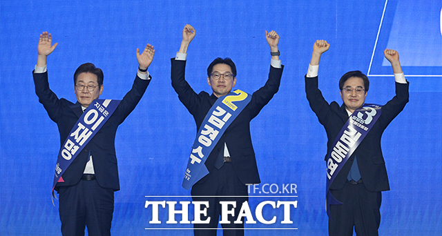 [더팩트|고양=박헌우 기자] 이재명, 김경수, 김동연 더불어민주당 경선 후보(왼쪽부터)가 27일 오후 경기 고양시 킨텍스에서 열린 더불어민주당 제21대 대통령선거 후보자 선출을 위한 수도권·강원·제주 합동연설회에 참석해 기념촬영을 하고 있다.