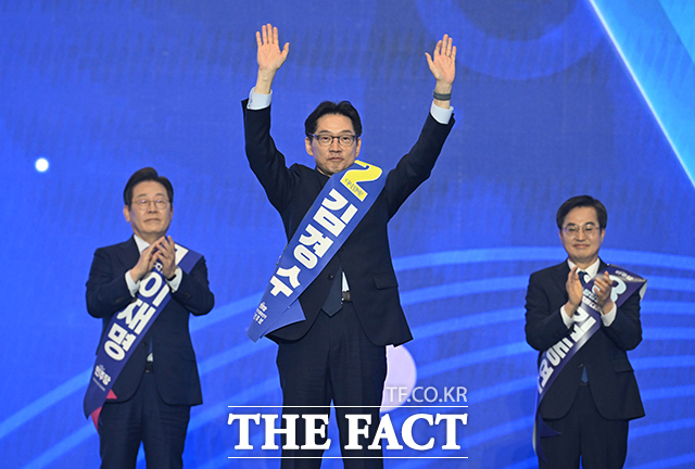 [더팩트|고양=박헌우 기자] 김경수 더불어민주당 경선 후보가 27일 오후 경기 고양시 킨텍스에서 열린 더불어민주당 제21대 대통령선거 후보자 선출을 위한 수도권·강원·제주 합동연설회에 참석해 인사를 하고 있다.