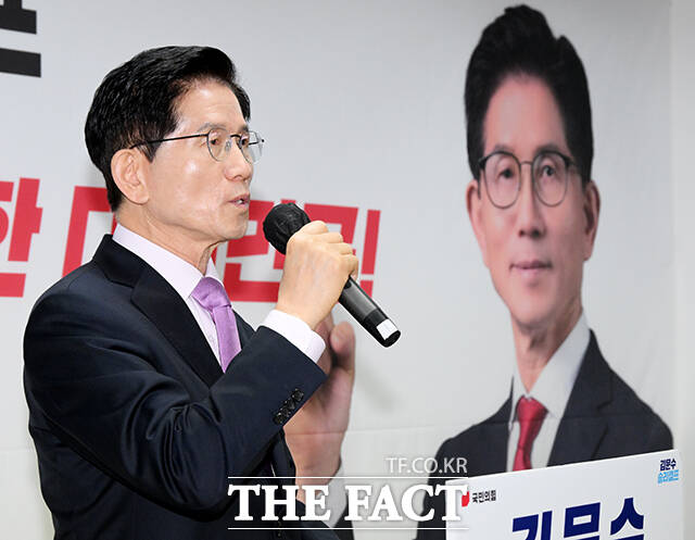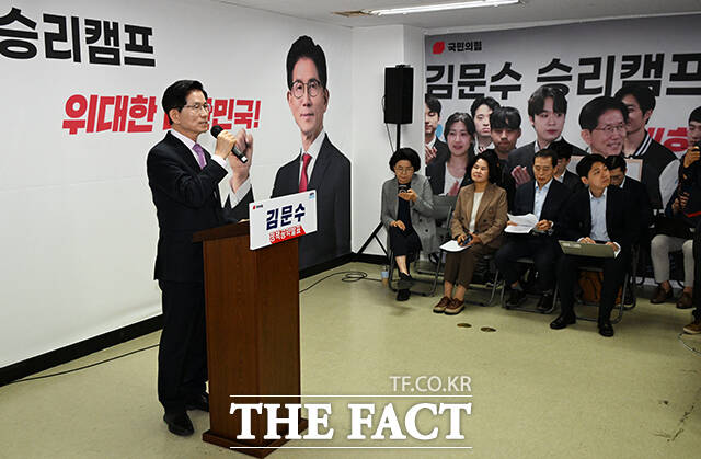 [더팩트ㅣ배정한 기자] 김문수 국민의힘 제21대 대통령 선거 경선 후보가 28일 오전 서울 여의도 대하빌딩에 마련된 사무실에서 '수출 5대 강국 도약' 공약을 발표하고 있다.