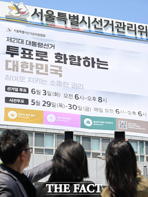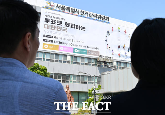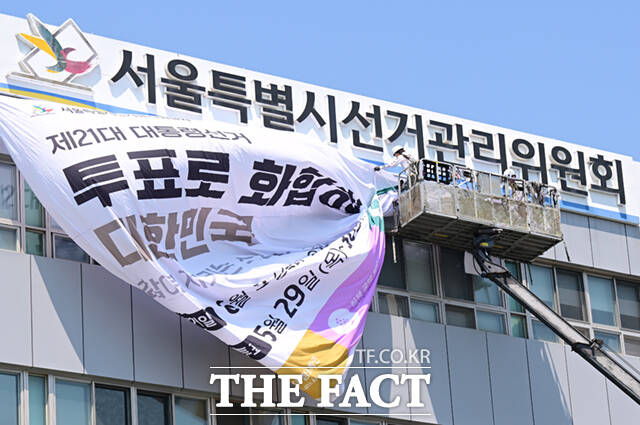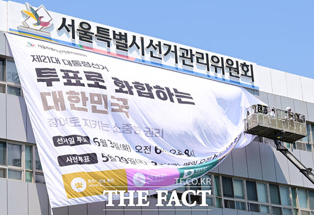 [더팩트ㅣ이새롬 기자] 제21대 대통령선거를 35일 앞둔 29일 오후 서울 종로구 서울특별시선거관리위원회 청사 외벽에 대형 홍보 현수막이 설치되고 있다.