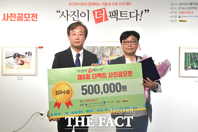 [더팩트ㅣ장윤석 기자] 보건복지부와 함께하는 저출생 극복 프로젝트 <사진이 '더'팩트다> 시상식이 30일 오후 서울 마포구 KT&G 상상마당 홍대 갤러리에서 열린 가운데 정재웅 더팩트 편집국장(왼쪽)과 디지털카메라 부문 최우수상을 받은 김석진 씨가 기념촬영을 하고 있다.