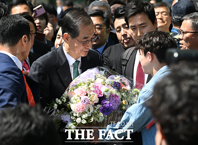 [더팩트ㅣ국회=박헌우 기자] 한덕수 전 대통령 권한대행 겸 국무총리가 2일 오전 여의도 국회에서 제21대 대통령 선거 출마 선언을 마치고 지지자로부터 꽃다발을 건네받고 있다.