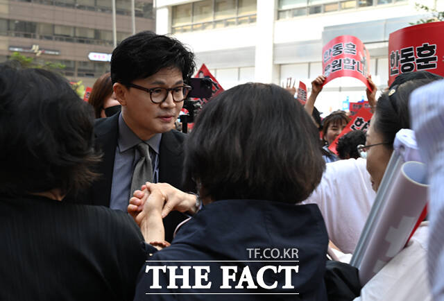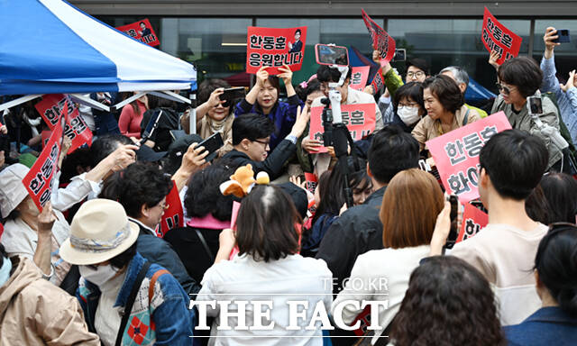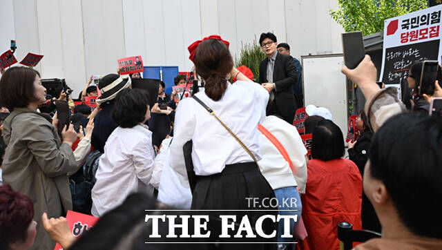선거캠프 해단식 앞서 지지자들 만난 한동훈 [TF사진관]