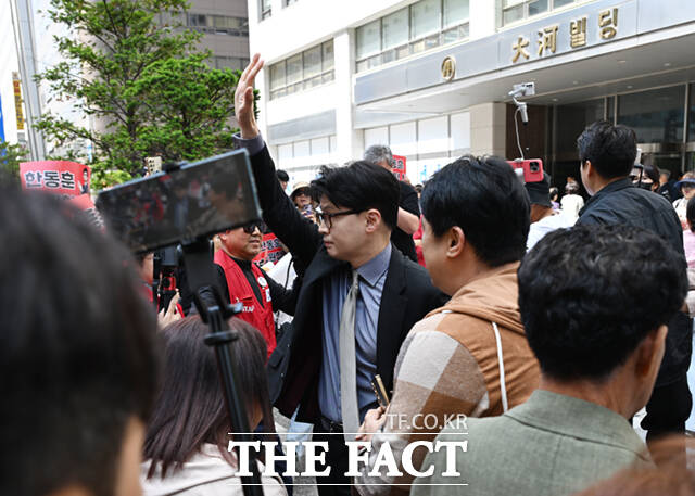 국민의힘 최종 후보에 탈락한 한동훈 국민의힘 전 대표가 7일 오후 서울 여의도 대하빌딩에서 캠프 해단식에 앞서 지지자들에게 인사하고 있다. /이새롬 기자