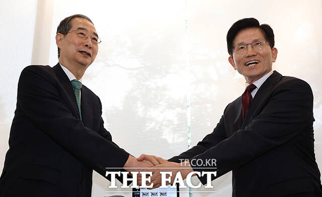 [더팩트ㅣ박헌우 기자] 한덕수 무소속 대선 예비후보(왼쪽)와 김문수 국민의힘 대선 후보가 7일 오후 서울 종로구의 한 식당에서 후보 단일화 관련 회동에 앞서 악수하고 있다.