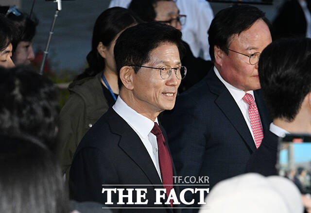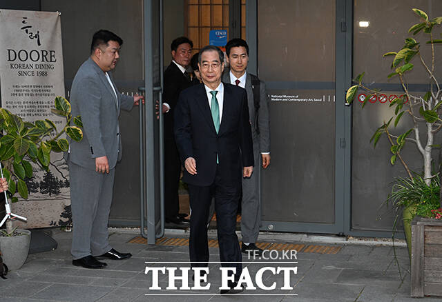 [더팩트ㅣ박헌우 기자] 한덕수 무소속 대선 예비후보(왼쪽)와 김문수 국민의힘 대선후보가 7일 오후 서울 종로구의 한 식당에서 대선 후보 단일화 관련 회동을 마친 후 식당에서 나오고 있다.