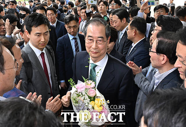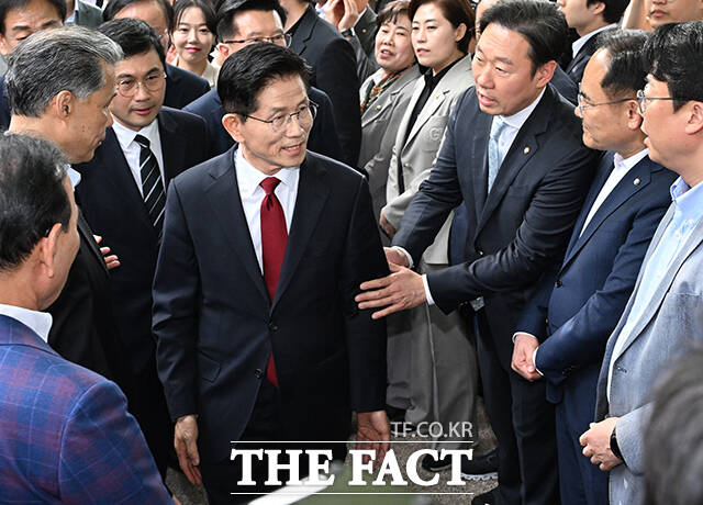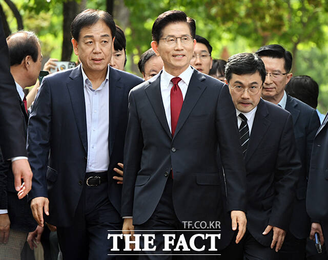 [더팩트ㅣ국회=배정한 기자] 김문수 국민의힘 대선 후보(왼쪽)와 한덕수 무소속 대선 예비후보가 8일 오후 서울 여의도 국회 사랑재의 한 카페에서 단일화 관련 회동을 하기 위해 이동하고 있다.