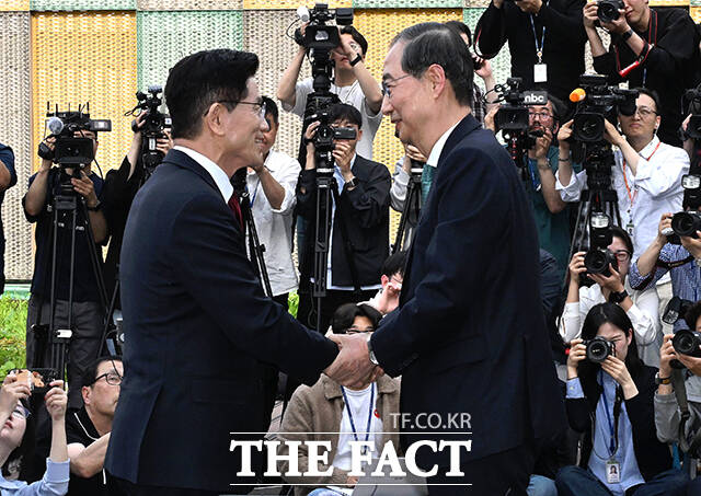 공개된 장소에서 단일화 논의하는 김문수와 한덕수 [TF사진관]