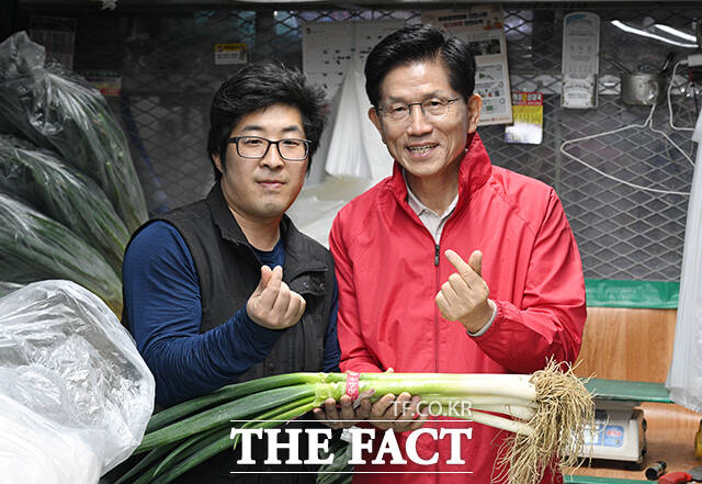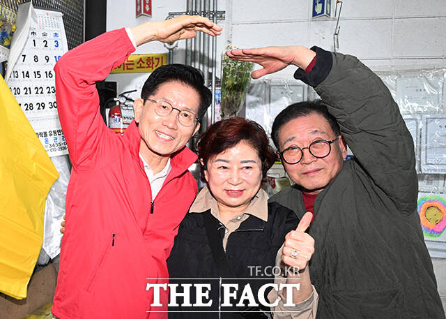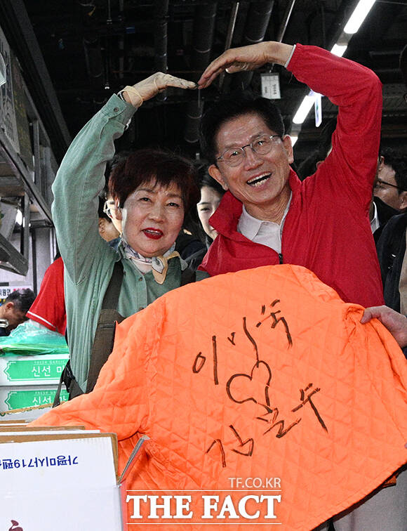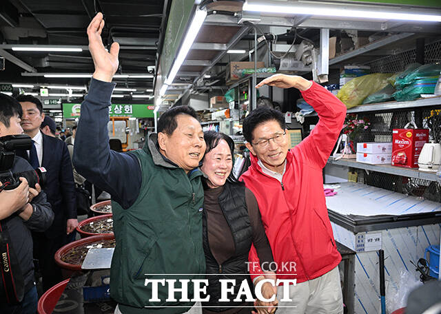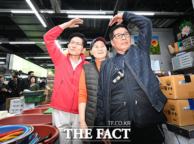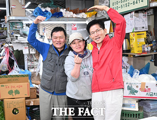 [더팩트ㅣ박헌우 기자] 김문수 국민의힘 대선 후보가 12일 오전 서울 송파구 가락시장을 찾아 상인들과 기념촬영을 하고 있다.