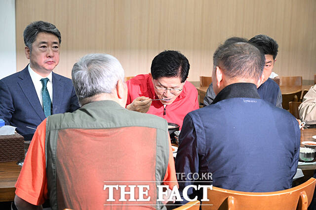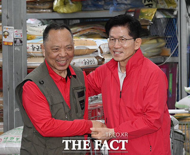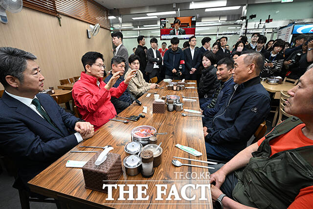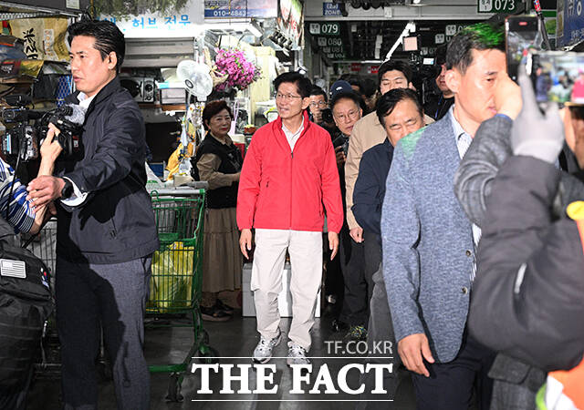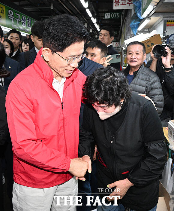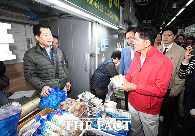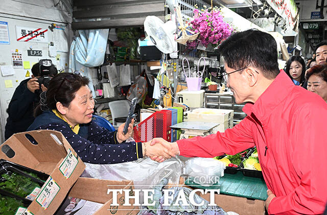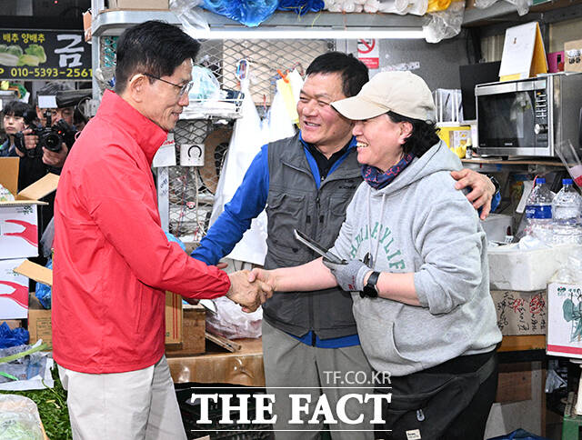 [더팩트ㅣ박헌우 기자] 김문수 국민의힘 대선 후보가 12일 오전 서울 송파구 가락시장을 찾아 상인과 대화를 나누고 있다.