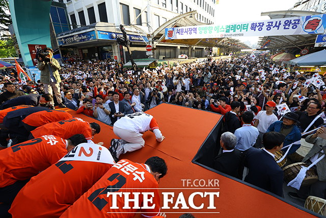 [더팩트ㅣ박헌우 기자] 김문수 국민의힘 대선 후보가 12일 오후 대구 중구 서문시장을 방문해 시민들에게 큰절하고 있다.cjg05023@tf.co.kr사진영상기획부 photo@tf.co.kr