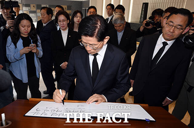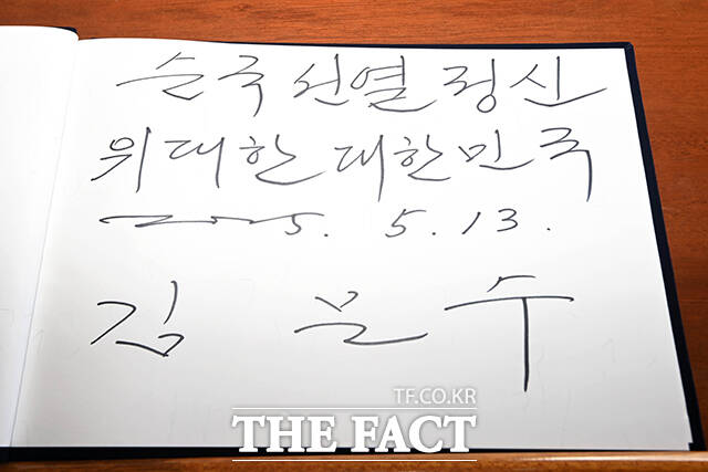 단충사 참배를 마친 김 후보는 '순국선열 정신 위대한 대한민국'이라는 글을 방명록에 남겼다.