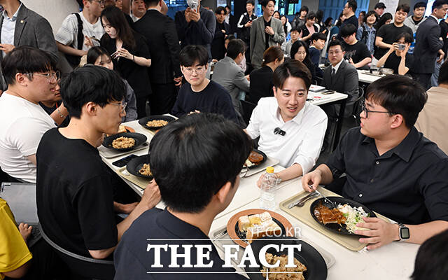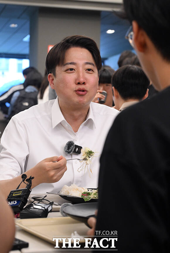 [더팩트ㅣ임영무 기자] 이준석 개혁신당 대선 후보가 13일 오후 대구 북구 경북대학교 학생식당을 찾아 식사중인 학생들과 대화를 나누고 있다.
