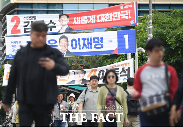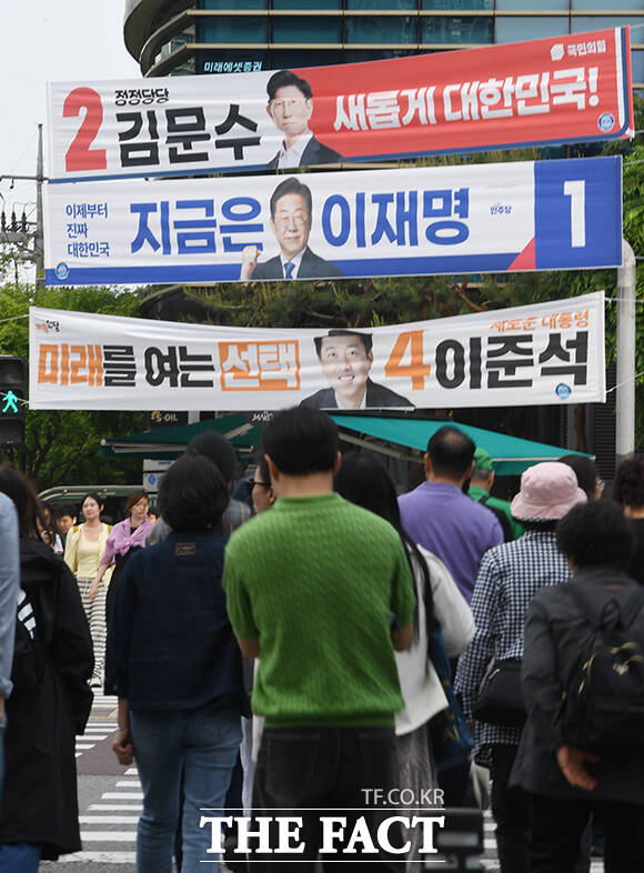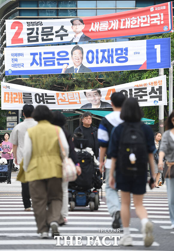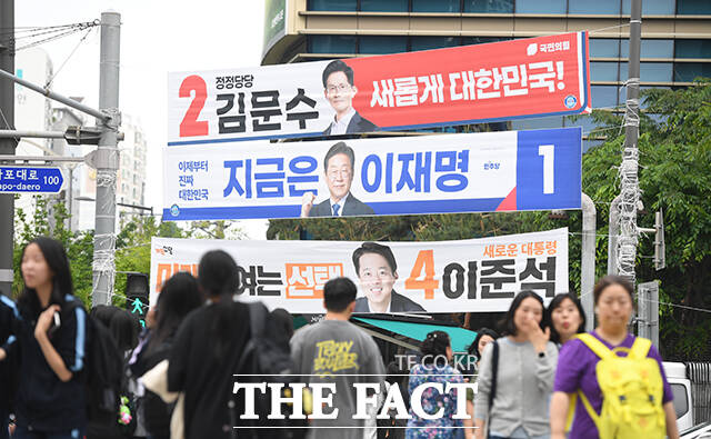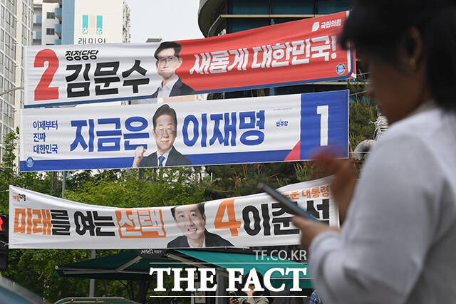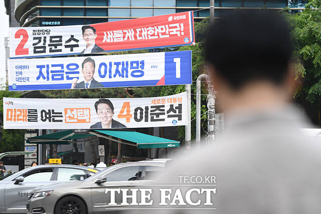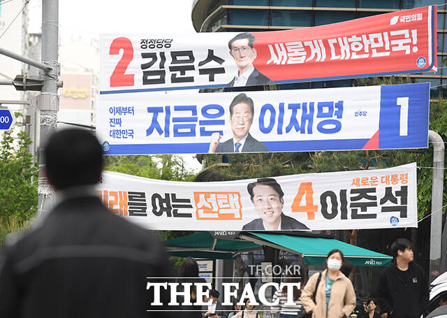 [더팩트ㅣ장윤석 기자] 제21대 대통령 공식 선거운동 둘째 날인 13일 오후 서울 마포구 한 거리에 이재명 더불어민주당 대통령 후보와 김문수 국민의힘 대통령 후보, 이준석 개혁신당 대통령 후보의 현수막이 걸려 있다.