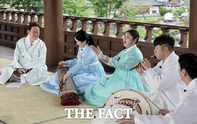 [더팩트ㅣ이새롬 기자] 이재명 더불어민주당 대선 후보가 16일 오후 전북특별자치도 전주시 완산구 청연루에서 열린 K-컬처 ‘전통의 소리를 잇다-청년 국악인과의 간담회‘에 참석해 장구를 배우고 있다.