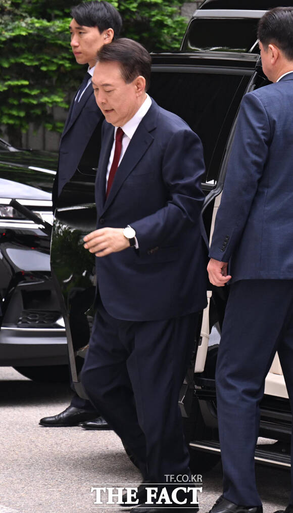 [더팩트ㅣ이새롬 기자] 윤석열 전 대통령이 19일 오전 서울 서초구 중앙지방법원에서 열린 내란 우두머리 혐의, 직권남용 권리행사방해 혐의 사건 4차 공판에 출석하고 있다.
